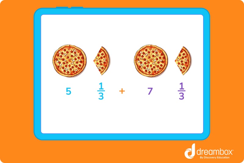 Let’s imagine we have two picnic tables of pizza. One table has 5 whole pizzas and 1/3 of another pizza, and the second table has 7 whole pizzas and another 1/3 of a pizza.