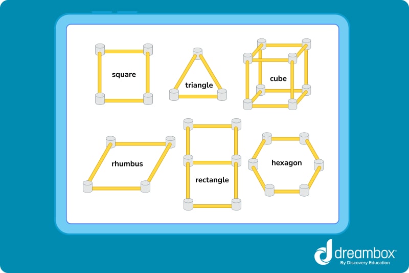 First graders will then form shapes using marshmallows and toothpicks. When completed, talk about the number of sides and vertices on each shape. After students can build 2D shapes, work on creating 3D shapes, such as cones, cubes, or pyramids.
